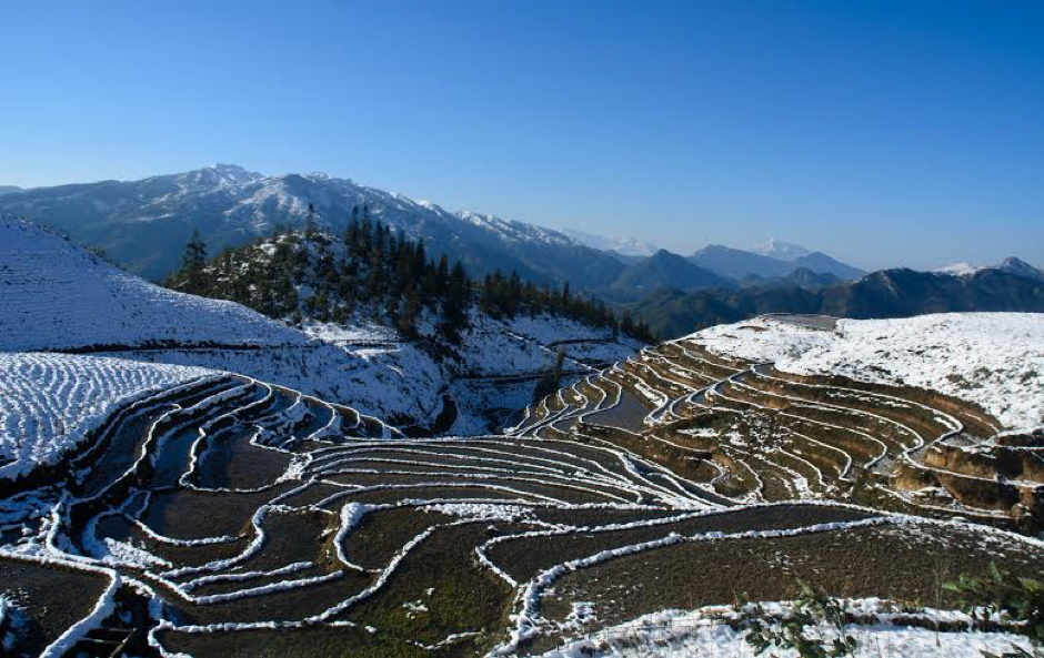 位於越南西北部老街省的沙壩是其中一個觀雪的好地方。沙壩位處海拔1650米的高原,每年的十二月至一月之間,當氣溫下降到一定溫度的時候便會下雪。沙壩最為人熟悉的綠油油的梯田,此時被雪花覆蓋,又有另一番意境。