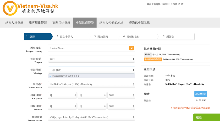 – 在線申請越南落地簽證的服務費用(只可用在本網站):35美元;在機場蓋章的費用:135美元。