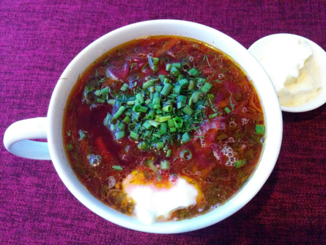 羅宋湯Borsch,源自烏克蘭,也是俄羅斯家常湯的一種。跟港式羅宋湯不一樣,Borsch用紅菜頭,薯仔和肉等製成,飲用時在湯里加入一小匙酸忌廉攪拌。湯帶有一點酸,非常開胃。