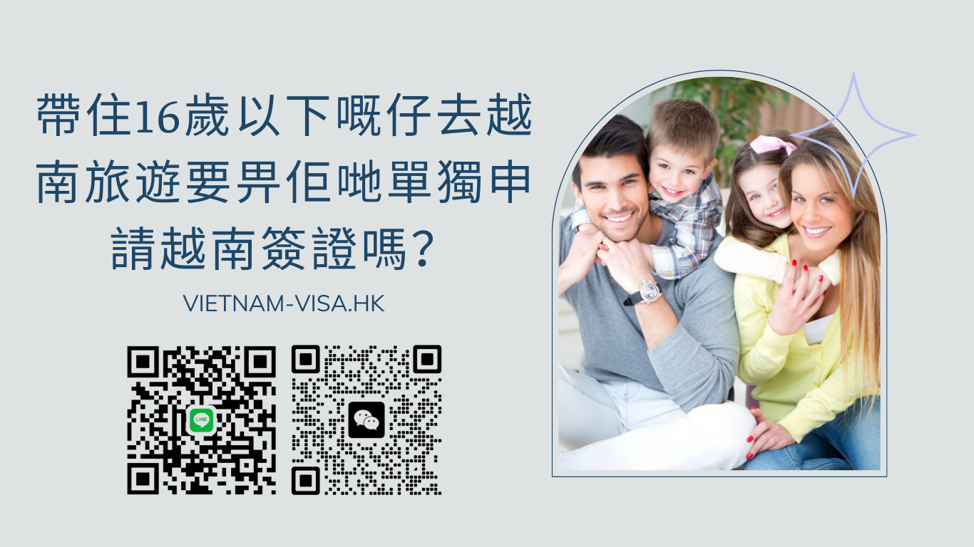 根據越南嘅簽證法規,無論年紀大細,每一位前往越南嘅旅客都要持有有效嘅越南簽證。就,即使你個仔尚未滿16歲,都要為佢前申請越南簽證。
