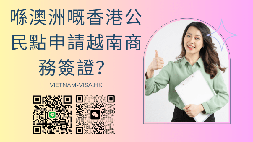 越南商務簽證招畀計畫前往越南出差、考慮市場、合作、參加會議或進行商務活動。越南商務簽證俾你喺越南境內停留最長90日,以處理業務事宜。喺澳洲嘅香港公民有三種申請越南商務簽證嘅方式:
