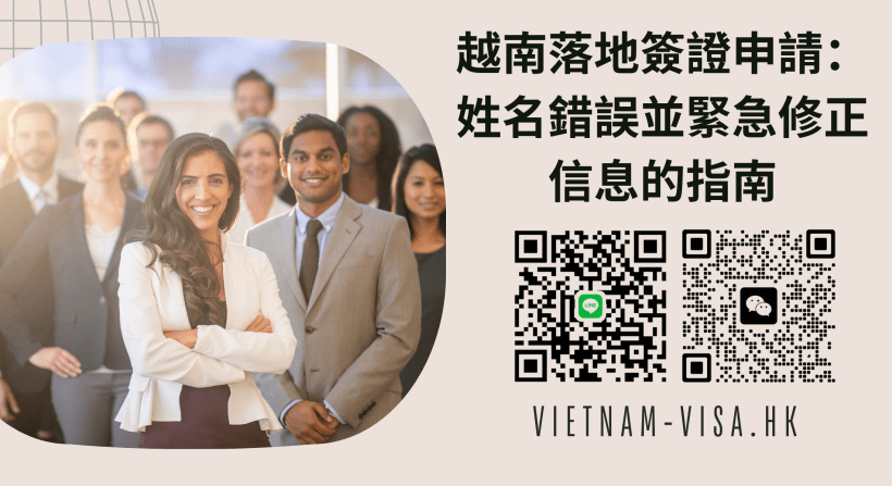 如果您已經到機場但發現簽證上的姓名有誤,請不要擔心。我們提供緊急修正信息服務,可以在30分鐘內為您解決這個問題。發送電子郵件至 info@vietnam-visa.hk 或通過 LINE/微信聯繫我們 (vietnam-visa)